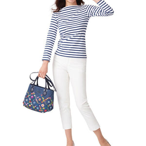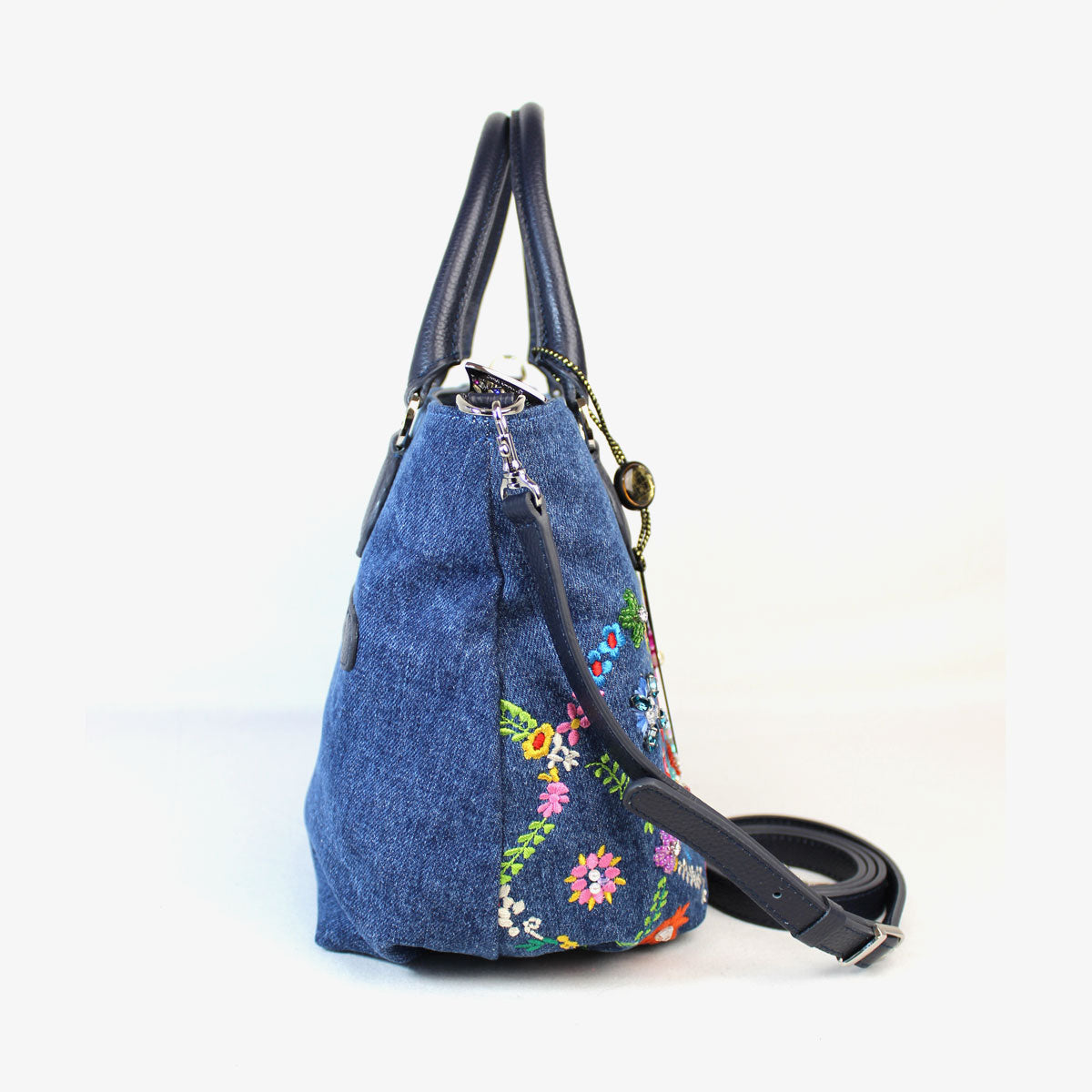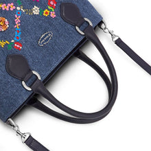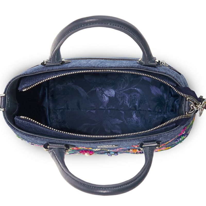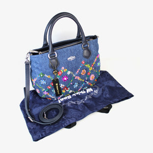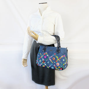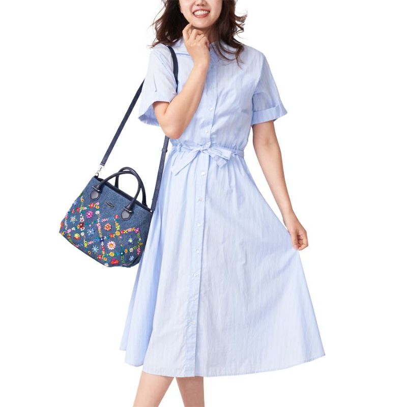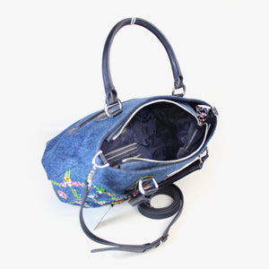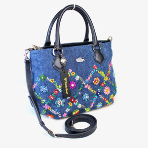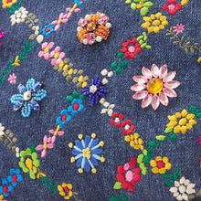 ウォッシュ加工を施した爽やかなジーンズ生地に、カラフルな花々を刺繍した「オーバーザレインボー」。格子状に連なる花々の間に咲く花たちは、スワトウ工房の職人が丁寧に手刺繍で仕上げました。爪付きのスワロフスキー・クリスタルをはじめビーズやスパンコール、ラインストーンがちりばめられ、キラキラと煌きを放ちます。
